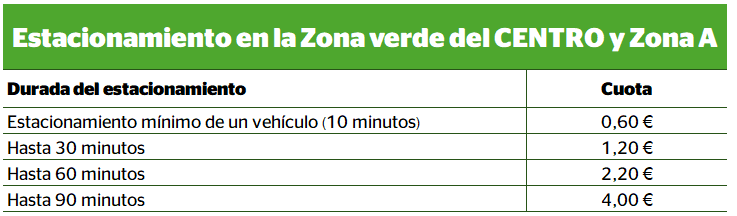 El estacionamiento de vehículos de duración limitada en cualquier zona verde del ámbito del centro, los horarios y las cuotas a aplicar, por vehículo, unitariamente, son las siguientes: